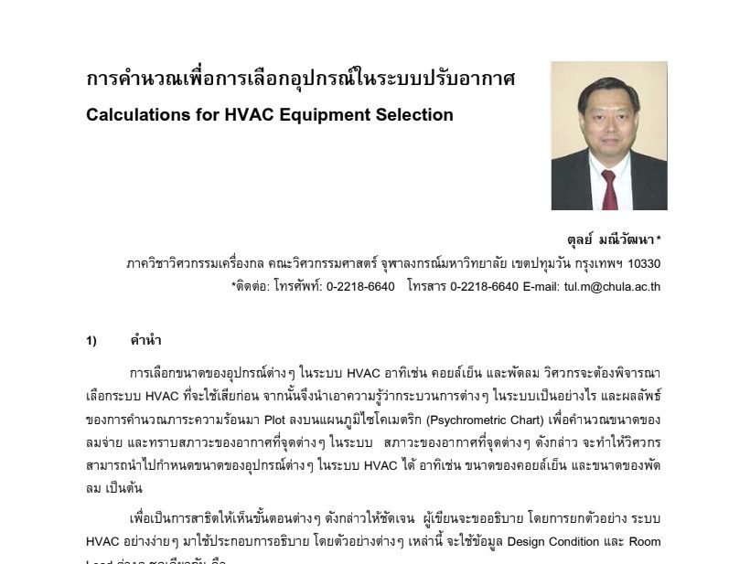 การคำนวณเพื่อการเลือกอุปกรณ์ในระบบปรับอากาศ (บทความวิชาการ)